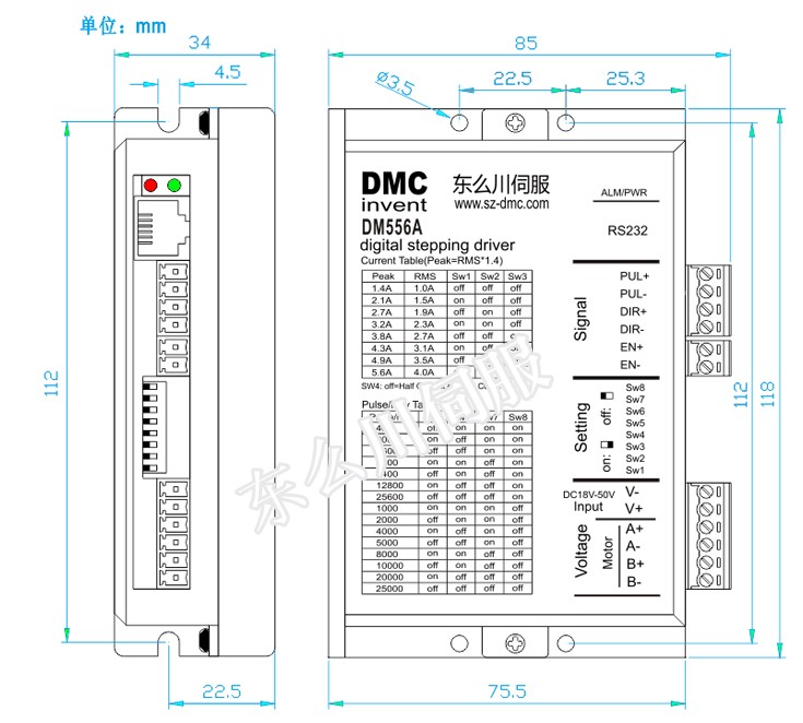 DM556A采用最新 32位處理器DSP為運算核心,用戶可以設置 65535 內的任意細分以及額定電流內的任意電流值,能夠滿足大多數場合的應用需要。由于采用內置微細分技術,即使在低細分的條件下,也能夠達到高細分的效果,低中高速運行都很平穩,噪音超小。驅動器具有電機參數學習及控制參數自動整定,及運行過程微調自適應參數的變化功能,能夠針對不同電機自動生成最優運行參數,最大限度發揮電機的性能。